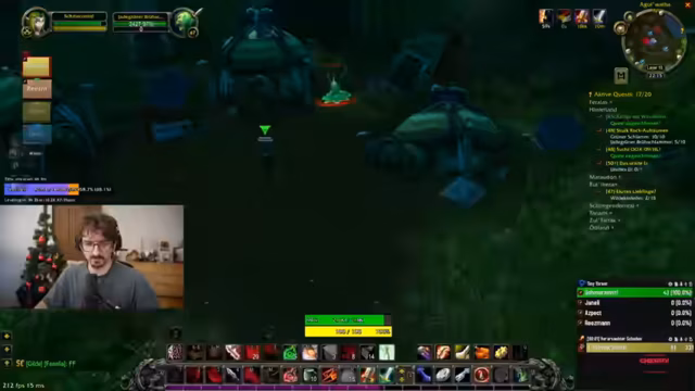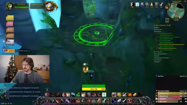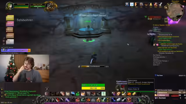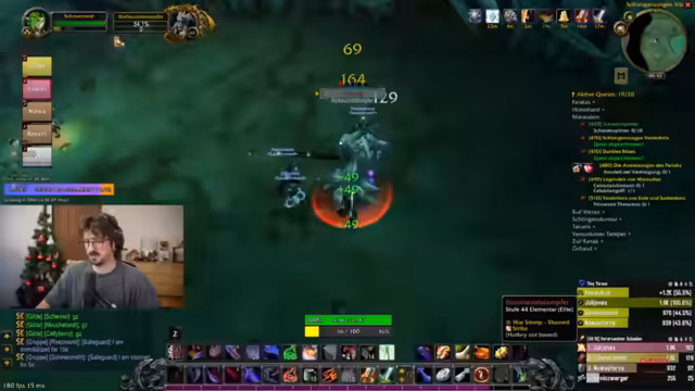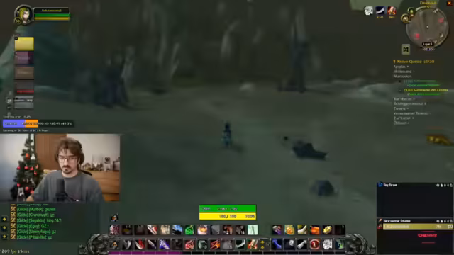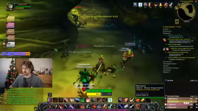 13:15:47The group engages in the 'Schattensplitter-Quest', requiring each member to kill 10 enemies for an amulet that grants +20 Attack Power. They discuss loot drops, including a staff and various items, and strategize about farming these drops efficiently. There's talk of using a special staff for dungeon skips, highlighting the importance of item management and coordination for quest completion, with mentions of specific enemies like the 'Rotwurzel-Stampfer'.
