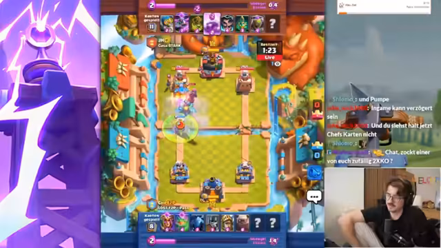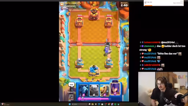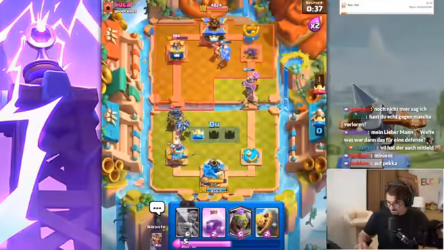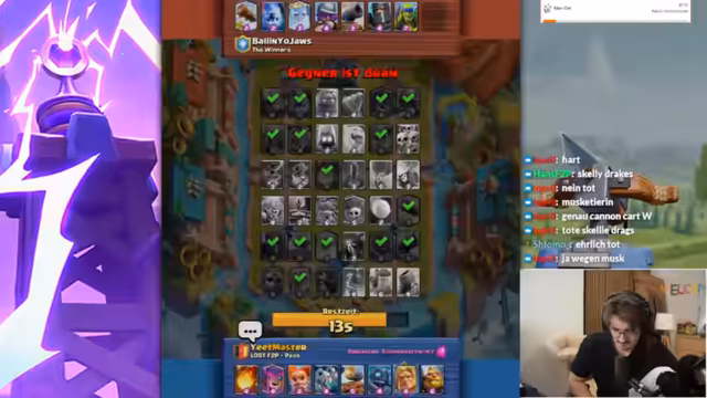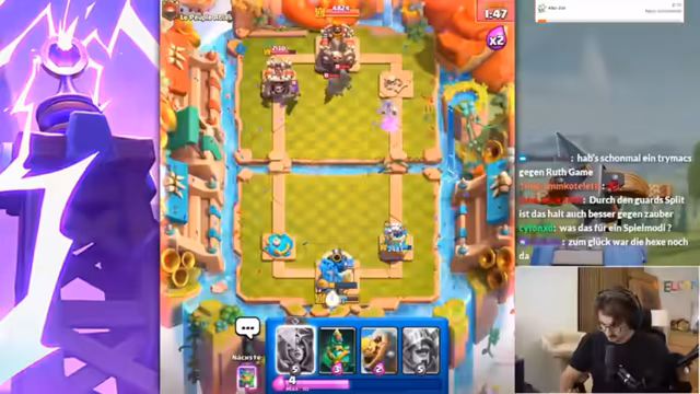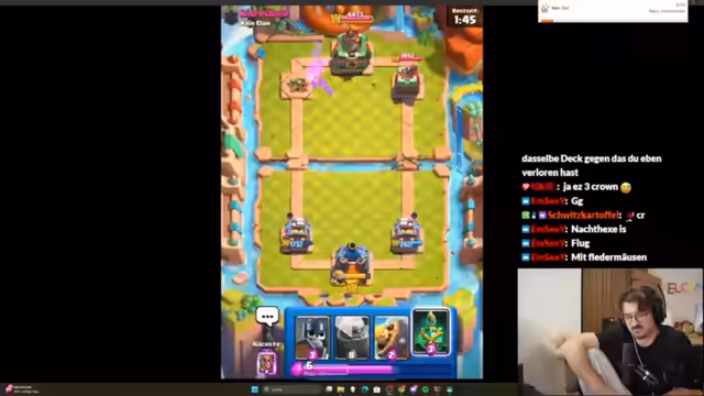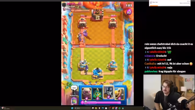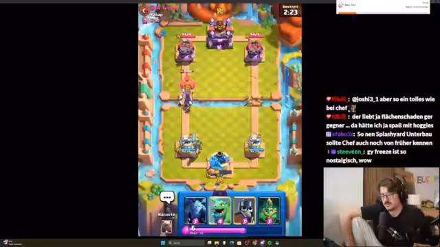 02:43:53Der Streamer muss anfangs feststellen, dass er den Koch nicht im Deck hat, was für das aktuelle Meta-Deck jedoch unproblematisch ist. Er erkennt schnell, dass der Gegner stark übercommitet und dabei viel Elixir verschwendet. Im Verlauf der ersten Züge wird analysiert, dass es sich um ein Drill-Deck mit Koch handelt und dass die Hexe eine zentrale Karte ist, um den Gegner in Schach zu halten. Die Anfangsphasen sind von taktischen Fehlern geprägt, da der Streamer versucht, den Golem richtig zu platzieren und den Gegner unter Druck zu setzen.