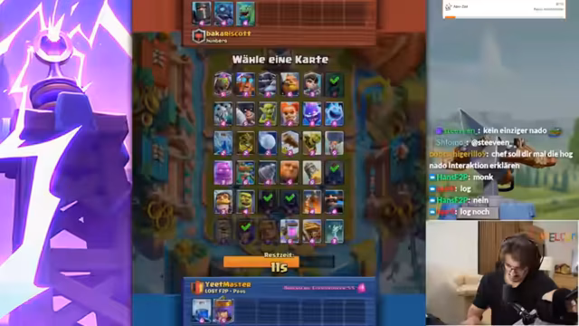03:13:01Nach mehreren verlorenen Runden wird das Thema auf den Clan Free to Play Plus Lost gelenkt. Der Streamer fragt den Chat, wie man einen Clanmitglied zum Testspiel einlädt, da er Gameplay-Probleme mit dem Platzieren des Babydrachen hat. Dies zeigt den Wunsch, die taktische Zusammenarbeit zu verbessern. Gleichzeitig gibt es eine Diskussion über Spielstile und Taktiken gegen Fast-Cycle-Decks, bei denen es darum geht, so wenig Schaden wie möglich zu nehmen, um später in der Elixir-Phase eine Gegenoffensive starten zu können.