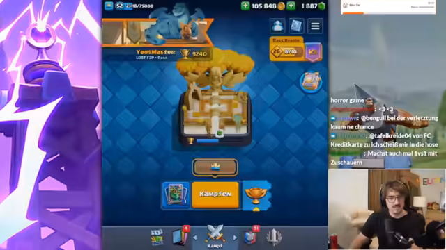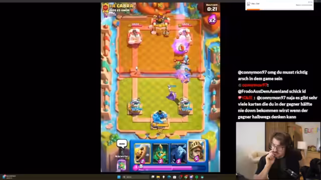 01:48:25Der Streamer wechselt zu dem Spiel Clash Royale, wo er ein neues Deck vorstellt, das er als einfach und wirkungsvoll bezeichnet. Es basiert auf Karten wie Goblin Giant, Ofen, Prinz und Ranken. Er spielt mehrere Runden und analysiert seine Fehler und Erfolge live. Bei einem Sieg gibt er zu, unvorsichtig gespielt zu haben, und bei einer Niederlage erkennt er an, dass sein Gegner ein starkes Deck spielte und er besser hätte verteidigen müssen. Er ist überzeugt, dass das Deck, wenn es korrekt gespielt wird, sehr effektiv ist und versucht, den Chat bei Laune zu halten.