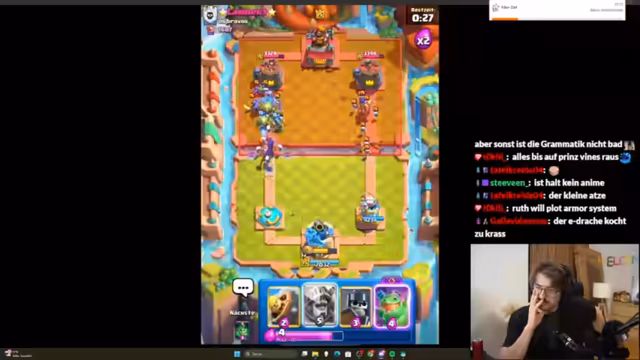 02:34:52Auf Anfrage eines Zuschauers beginnt der Streamer, ein neues Deck in Clash Royale zu coachen. Er erklärt die Verwendung eines Evo-Hexe-Decks mit Karten wie Prinz, Golem, Vines und Evo-Drache. Er betont, dass das Spiel mit diesem Deck nicht perfekt sein muss und es darauf ankomme, die evolutionären Karten zu zyklischen und einen starken Gegenangriff aufzubauen. In einem gespielten Spiel demonstriert er, wie man trotz anfänglicher schlechter Kartenlage durch clevere Verwendung der Einheiten und忍耐 einen klaren Sieg erzielt.