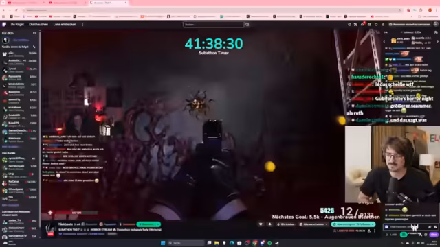 10:50:03Das Team hat nur noch ein Level vor sich (606) und erreicht den Endboss. Dies ist ein Elden-Ring-ähnlicher Boss, der nur von seinen eigenen Waffen getroffen werden kann. Das Team muss seine Angriffe ausweichen und gleichzeitig die von ihm kontrollierten Altare zerstören. Der Kampf ist komplex und erfordert Koordination, um die Angriffe des Bosses zu überleben. Gleichzeitig gibt es Ablenkungen, als ein Chat-Mitglied ein vermeintlich versprochenes Horror-Spiel spielt, was bei vielen im Publikum für Unmut sorgt.