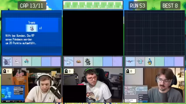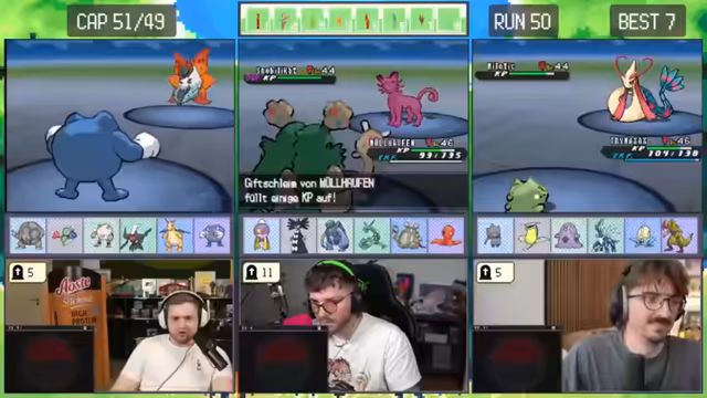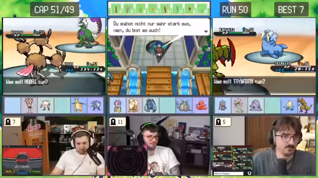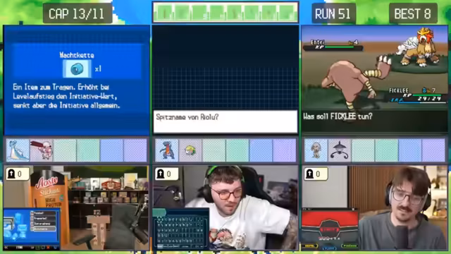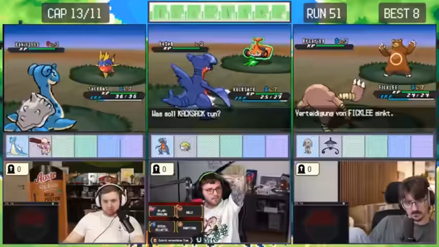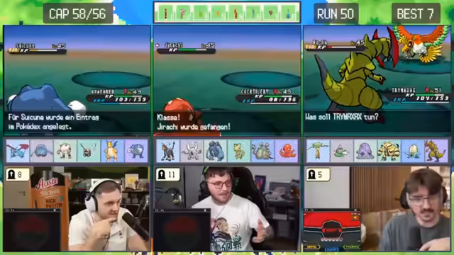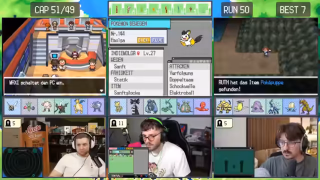 04:55:13Nach dem Neustart eines Runs beginnt das Team mit einem neuen Starter-Pokémon, Kickly. Sie planen, bis zum Dowsinghof zu spielen, wobei die Erfolgschance gegen einen starken Gegner nur bei 20% liegt. Trotz der geringen Wahrscheinlichkeit und des Risikos, das Pokémon zu verlieren, entscheiden sie sich dafür, weiterzuspielen und nicht erneut neu zu starten.