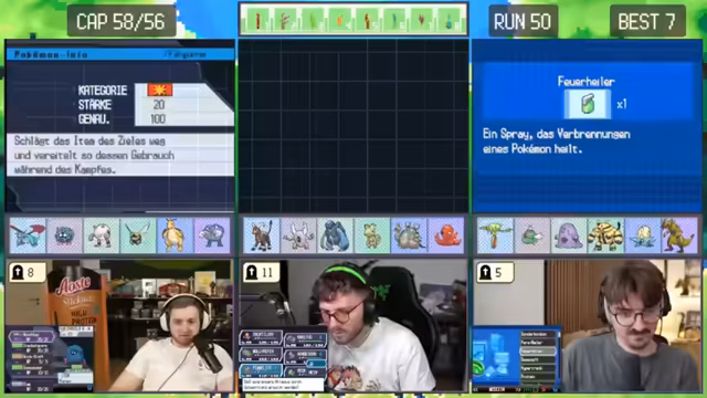 06:29:46Das Streamziel ist der Kauf eines Meisterballs, der 3000 Poké-Dollar kostet. Der Streamer ist sich der geringen Erfolgswahrscheinlichkeit bewusst und konzentriert sich darauf, in der Arena die Top 2 zu erreichen. Ein Vorfall, bei dem ein Gegnertrainer durch Regirock besiegt wird, wird kommentiert. Eine Begegnung mit einem Pokémon der verborgenen Fähigkeit, die den Pokémonwechsel verhindert, wird als unglücklich und ärgerlich empfunden. Die typischen Stärken von Käfer- und Stahl-Pokémon werden hervorgehoben, insbesondere die Resistenz gegen viele Angriffe und die einzige Schwäche gegen Feuer.
