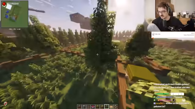 Der Spieler beginnt seine Minecraft-Frühschicht und widmet sich Bauprojekten wie dem fast fertigen Dowsinghof. Er überlegt, welche Farm ihn im Spiel 'geisteskrank OP' machen könnte, da eine neue Aufgabe ansteht. Parallel dazu werden im Chat vermeintliche Spieler-Bans und technische Fragen diskutiert. Er spekuliert über die Altersgruppe seiner Zuschauer, fragt nach schnellerer Bewegung unter Wasser und teilt seine Auswanderungsgedanken, wobei die Schweiz und Japan als Optionen genannt werden.