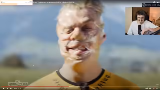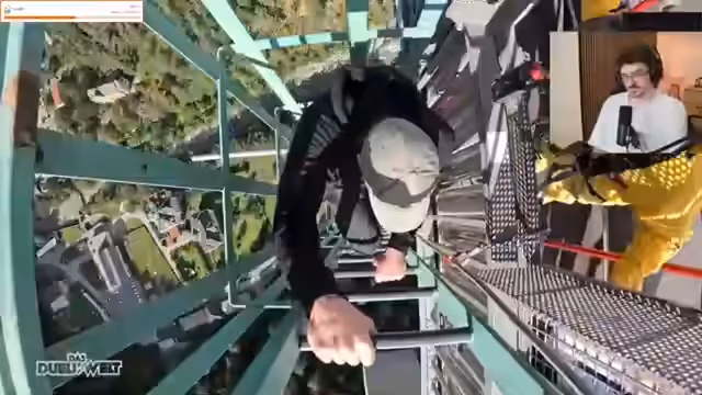 08:21:15Der Streamer beschreibt seine Reaktion auf die Enthüllung einer riesigen Brücke im Hintergrund und seine Befürchtung, daran zu hängen. Er erhält ein Video von Klaas, der ihn auffordert, ein letztes Experiment zu meistern. Dabei wird ein Gewicht freigesetzt, das ungebremst in die Tiefe donnert, während er an einem Seil hängt. Er äußert sein Unbehagen und seine mangelndes Verständnis für die physikalischen Zusammenhänge. Ein vorheriger Versuch mit einem Männchen scheiterte, was seine Skepsis verstärkt. Er lernt den Stunt-Koordinator Tom kennen und wird auf die Brücke geführt, wo er das erste Mal die extreme Höhe realisiert. Er bemerkt, dass die Konstruktion mit Spanngurten und Holz vom Obi-Markt befestigt ist, was seine Sicherheitsbedenken verstärkt. Das Gegengewicht entpuppt sich als leichte "Kennebill", was seine Zweifel weiter nährt. Er reflektiert, dass er sein Leben in die Hände von Leuten legt, die er kaum kennt und denen er vertrauen muss. Er erhält einen "Quick Release", den er selbst auslösen muss, was die Situation zusätzlich erschwert. Er beschließt, es einfach zu tun, bevor er zu lange nachdenkt.