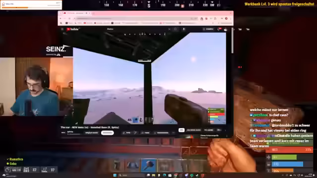 14:04:18Der Streamer analysiert die erfolglose Raid-Aktion von Chef Strobel gegen seine Base. Er kritisiert die schlechte Verteidigung mit einer einzelnen Metalltür und das riskante Verhalten beim Versuch, sein Boot zurückzuholen. Das VOD-Review zeigt, dass Chef Strobel die Reste auf der Ölbauinsel lootete, was seine Position gefährdete. Er wird als Spiel beschrieben, der das Spiel erst langsam lernt, aber gleichzeitig übermäßig viel lootet, was ihn anfällig für Angriffe macht.