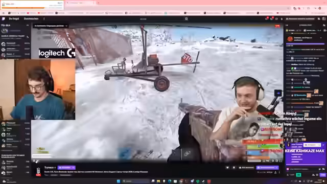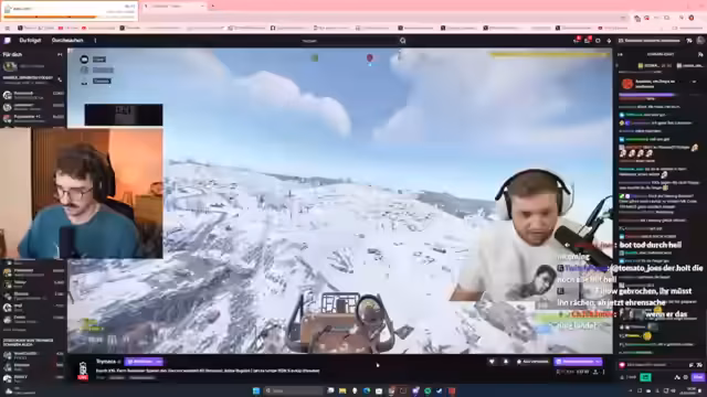 13:08:00Nach der Landung auf der Oil-Rig wird Micky sichtbar, der sofort das Feuer eröffnet. Der Streamer muss mit dem Helikopter abdrehen, um nicht abgeschossen zu werden. Währenddessen wird im Chat kommuniziert, dass Sane von Donald Klatsch getötet wurde, was die Teamdynamik verändert. Die Strategie wird angepasst: Statt eines direkten Angriffs soll der Helikopter noch einmal abdrehen, um Micky und eventuelle andere Spieler aus dem Hinterhalt zu provozieren.