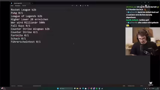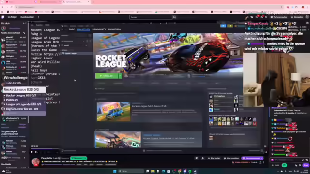 00:56:18Es wird überlegt, ob Aram in League of Legends realistisch ist, und Arena wird als möglicher Ersatz diskutiert, obwohl noch nie gespielt. Guess the Game wird als nicht geeignet für eine Win-Challenge angesehen. Stattdessen wird ein Puzzle in Betracht gezogen. Ein Assoziationsspiel, bei dem die gleichen Wörter gesagt werden müssen, wird als witzige Alternative vorgeschlagen. Das Puzzle wird als zu schwierig verworfen. Higher Lower soll gespielt werden, und die Zahl wird auf 20 festgelegt. Peak wird als nicht so geil empfunden und gestrichen. Counter-Strike Wingman back-to-back wird als gut befunden. Fortnite soll einen Win holen. Geogester und Golfit werden gestrichen. Schach und Führerscheintest bleiben drin, wobei der Führerscheintest als witzig und schnell gilt. Age of Empires, Demonologist und Arena Breakout werden hinzugefügt. Es wird überlegt, ob die Liste zu lang ist, und es wird festgelegt, dass die Deadline heute oder morgen ist. Morgen Abend spielt der Streamer Jackbox mit Freunden, zu dem Kevin eingeladen ist. Es wird beschlossen, die Win-Challenge morgen fortzusetzen. Kevin hat gesagt, dass er jeden Tag vor dem Stream nichts zu tun hat und etwas zum Zocken braucht. Es wird über die Dauer der einzelnen Spiele diskutiert, und Kevin hält die vorgeschlagenen Zeiten für unmöglich. Der Chat wird als Gaslighting wahrgenommen. Es wird vereinbart, weniger zu labern und mehr zu machen. Es wird überlegt, zwei Games gleichzeitig zu machen. Robin soll ein Overlay erstellen, das den Fortschritt der Challenge anzeigt. Es wird beschlossen, mit Rocket League Back-to-Back zu starten.