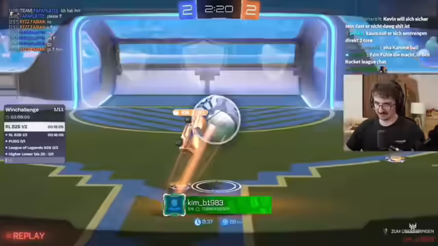 03:56:55Es wird befürchtet, dass man die ganze Nacht in PUBG verbringen wird. Nach dem Start von Rocket League wird festgestellt, dass man erstmal wieder reinkommen muss. Die Gegner werden als "Turbo-Dog" bezeichnet und die Farben im Spiel als ungewöhnlich wahrgenommen. Es wird ein "insane Fake-Shot" kommentiert. Die niedrige Elo der Gegner wird festgestellt. Es wird über die Spielweise der Gegner gelästert, die als "Dogshit" bezeichnet wird. Es wird ein unerwarteter Pass der Gegner kommentiert und als nicht geplant eingeschätzt. Nach einem Tor wird "Easy Claps" im Chat gefordert. Es wird ein weiterer "Fake" kommentiert und die Spielweise der Gegner als einstudiert bezeichnet. Nach einem weiteren Tor wird die Kommunikation im Team gelobt. Die Gegner werden weiterhin als "Dogshit" bezeichnet und die eigene Leistung hervorgehoben. Es wird ein Fehler des Teammates kommentiert und die eigene Leistung gelobt. Es wird ein Trick der Gegner kopiert und die eigene Leistung gelobt. Es wird über die Farben der Autos im Spiel diskutiert und die eigene Leistung gelobt.