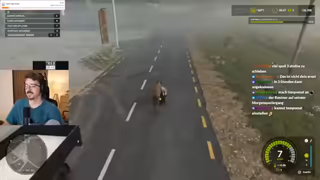 00:49:17Der Streamer spricht über sein Jahresziel von 150.000 Followern und ist aktuell bei 143.000. Er überlegt, ob er einfach Follower kaufen soll, wird aber davor gewarnt, da dies zu Problemen führen kann. Es wird festgestellt, dass Giants Software, die Entwickler des Spiels, im Chat anwesend sind, was für Begeisterung sorgt. Der Streamer entschuldigt sich für einen Kraftausdruck und lobt das Spiel. Es wird erwähnt, dass der Streamer und G-Time noch Kraftwerk spielen werden, wenn alle den Server für FitnaCraft verlassen. Der Streamer plant, noch zwei, drei Monate zu bauen. Es wird festgestellt, dass der Mähdrescher nicht in einem separaten Spiel gesteuert wird, sondern Teil des aktuellen Spiels ist. Der Streamer scherzt über die Auswirkungen von Schlafmangel. Es wird überlegt, ob man Giants Software fragen soll, was sie von Leuten halten, die einfach die Felder anstatt der Straßen benutzen, um Zeit zu sparen. Es wird erwähnt, dass Giants Software einen Stand auf der WasuGames.com hatte und dort einen riesigen Traktor ausgestellt hat.