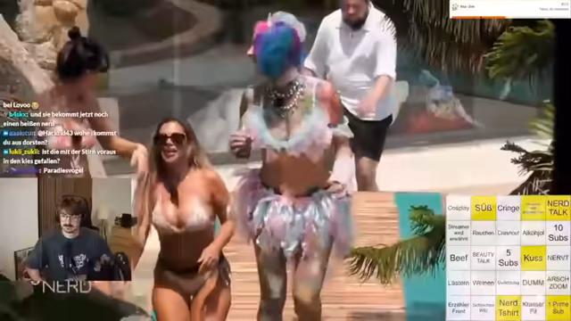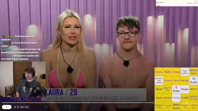 00:29:57Das Bingo-Spiel beginnt mit dem Start der ersten Folge der neuen Staffel von 'Beauty and the Nerd'. Der Streamer stellt die männlichen Nerds vor, darunter den Emo-Nerd Yannick mit seinem Ciel-Cosplay, Fakten-Nerd Darius, der noch nie geküsst war, und Fantasy-Nerd Aaron, der Rollenspiele liebt. Die Nerds kommen unterschiedlich gut rüber, während die ersten Beauties wie die self-propierte 'Zicke' Christina Shakira auf die Bühne kommen und ihre Meinungen zu den Nerds äußern. Es herrscht eine gemischte Reaktion und erste Anzeichen für spätere Konflikte sind bereits zu erkennen.