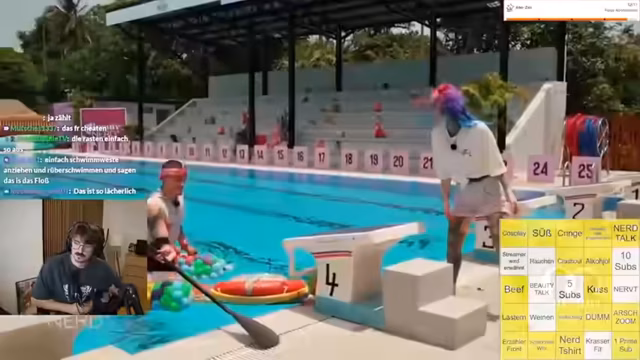 04:19:29Nachdem die Flöße fertiggestellt und in Superhelden-Kostüme gehüllt sind, beginnt das eigentliche Floßrennen. Die Teilnehmer kämpfen sich über das Wasser, während ihre Partner vom Ufer aus anfeuern. Das Rennen erweist sich als schwierig, da viele Konstruktionen instabil sind und das Paddeln herausfordernd ist, was zu einem chaotischen und unterhaltsamen Wettbewerb führt, bei dem letztendlich das Team von Kai und Degens als Sieger hervorgeht.