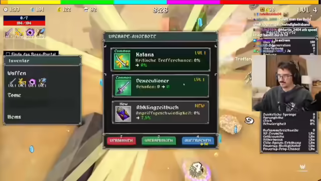01:28:23Das Gameplay von Megabonk wird fortgesetzt, wobei der Streamer verschiedene Strategien ausprobiert und anpasst. Es wird über die Notwendigkeit eines Resets im Spiel diskutiert und verschiedene Items werden ausgewählt oder verworfen. Der Bildschirm soll bei zu starkem Flackern verkleinert werden. Es wird festgestellt, dass das Fehlen von Waffen den Spielverlauf erschwert und ein Reset notwendig macht. Der Streamer erwähnt, dass er gelesen hat, dass irgendwann unzerstörbare Skelette kommen. Es wird überlegt, ob der Charakter mit Angriffsgeschwindigkeit skaliert und verschiedene Items werden ausprobiert, um die Effektivität zu testen. Drei Saugschreine werden erwähnt, die als vorteilhaft angesehen werden.
