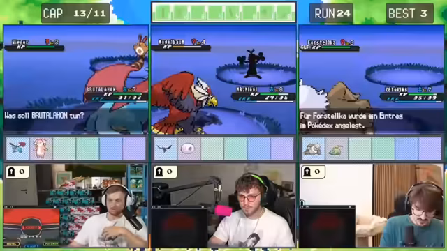 11:37:23Der Versuch, den Arenaleiter zu besiegen, scheitert kläglich nach einem harten Kampf. Wichtige Pokémon wie Brutalander und Aerodactyl gehen verloren, was zu einem Full-Wipe des Teams führt. Der Streamer ist frustriert über den Verlust seiner stärksten Pokémon, besonders da der Gegner, Amoroso, mit der Attacke Walzer das gesamte Team dezimiert. Das Team ist nun zu schwach, um weiterzukämpfen, und der Run ist damit vorerst beendet.
