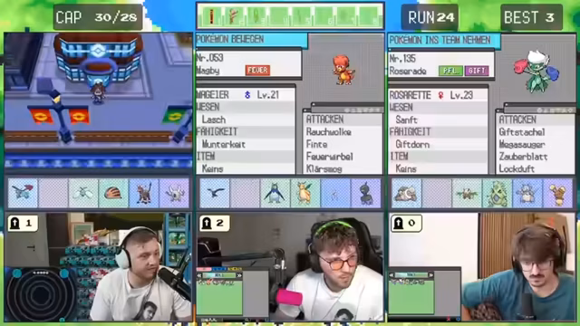 09:12:23Nach einem verlorenen Kampf wendet sich der Streamer dem Chat zu, um Lösungsstrategien zu besprechen. Es kommt zu einer Diskussion über den Einsatz bestimmter Items, das Fangen von Pokémon mit niedriger Fangrate und die Vermeidung von Self-Damage durch Attacken wie Konfusion. Gleichzeitig werden technische Aspekte wie die Bildschirmeinstellung und das Gaming-Setup thematisiert, was zu einem kurzen Side-Thema wird.