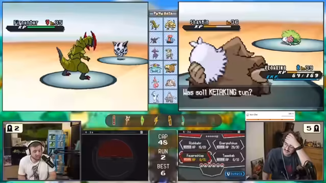 01:23:08Ein Schlüsselmoment ist der erste erfolgreiche Einsatz von Bidifas, der durch die Fähigkeit H₂O-Absorber den Gegner heilt und den Kampf dreht. Der Stream bewegt sich in eine neue Höhle, wo der Chat über die Mechaniken der Egelsamen und des dreifachen Kampfes diskutiert. Der Spieler muss eine komplexe Wahrscheinlichkeitsrechnung für einen Sieg aufstellen und die Taktik anpassen.
