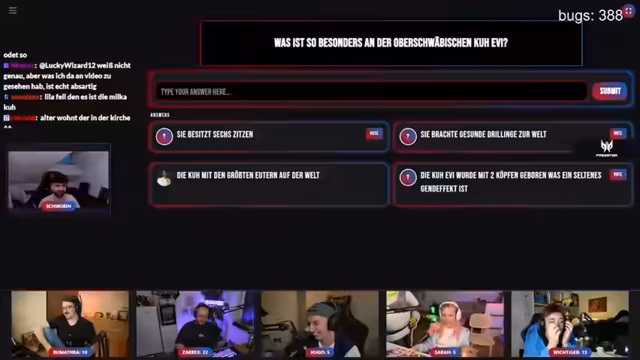 04:36:08Die Quizrunde wird fortgesetzt mit noch spezifischeren Fragen. Die Spieler raten, was ein 'Stegodon' sein könnte, dessen Antworten von 'Dinosaurier' bis zu 'Archäologin' reichen. Auch eine Frage über die Besonderheiten der 'oberschwäbischen Kuh Evi' wird gestellt, wobei humorvolle und unkonventionelle Antworten im Vordergrund stehen, während der Streamer seine eigene Leistung kritisiert.