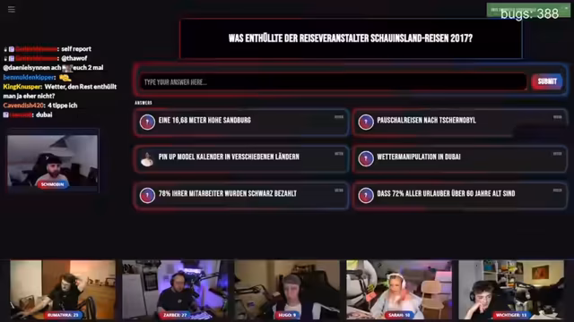 04:00:07Der Streamer erklärt die Regeln der Lügenpoker-Gameshow. Die Teilnehmer erhalten Fragen, auf die sie normalerweise keine Antwort kennen. Ihre Aufgabe ist es, eine möglichst realistische Antwort einzugeben, um die anderen vom Irrtum zu überzeugen. Wenn alle Antworten gesendet wurden, wird abgestimmt. Ein korrekter Tipp bringt einen Punkt, während die anderen Teilnehmer für das Abstimmen auf die falsche Antwort belohnt werden. Das Spiel beginnt mit der ersten Frage.