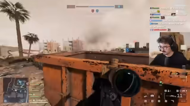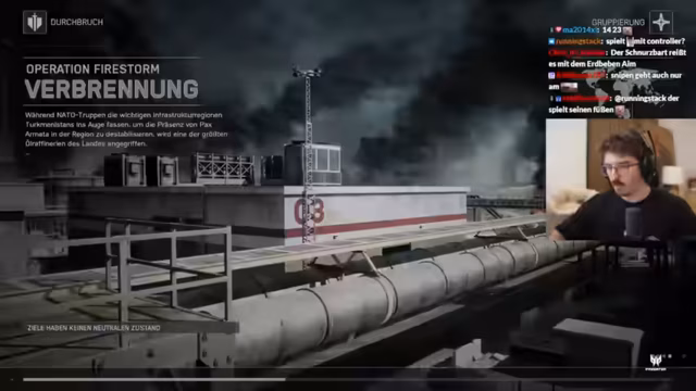 05:35:48Der Streamer findet sich nach einem AFK-Kick in einer prekären Lage wieder, da Gegner bereits die Dächer der höchsten Gebäude auf Punkt A besetzt haben. Er äußert seine Frustration über die schnelle Eroberung von Punkt B, die seiner Meinung nach auf seine kurze Abwesenheit zurückzuführen ist. Während er versucht, die Situation mit einem LMG zu kontrollieren, muss er feststellen, dass die feindlichen Scharfschützen auf den Dächern eine ernsthafte Bedrohung darstellen. Er beschreibt die gegnerische Scharfschützen-Sniper als extrem stark, da sie nur Headshots für einen One-Shot-Kill benötigt und eine hohe Feuerrate sowie Schalldämpfung besitzt, was sie schwer zu lokalisieren macht. Trotz seiner Bemühungen, die Scharfschützen auszuschalten, gelingt es ihm nur teilweise, da sie sich nach einem Treffer nicht mehr zeigen.