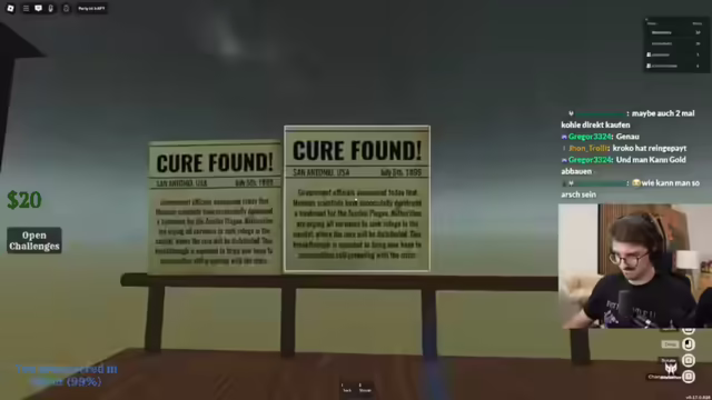05:30:08Die Roblox-Session beginnt mit anfänglichen Schwierigkeiten, da die Gruppe Probleme hat, gemeinsam einer Lobby beizutreten. Es gibt Verwirrung darüber, wer sich in welcher Lobby befindet und wie man dem richtigen Raum beitritt. Nach einigen Versuchen und Erklärungen gelingt es schließlich allen, sich in derselben Gruppe zusammenzufinden. Im Spiel selbst werden erste Vorbereitungen getroffen: Kohle wird gekauft und Waffen werden in Betracht gezogen. Es wird überlegt, wie man sich vor den Mobs schützen kann, indem man Schilder als Wände nutzt, um eine Basis zu errichten. Ein Spieler findet zufällig eine Waffe am Spawn, was die Gruppe weiter stärkt. Es wird kurz diskutiert, ob man die erste Nacht im Spiel abwartet, um sich dann besser vorbereitet auf den Weg zu machen.