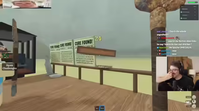 04:51:36Die Gruppe erkundet eine Train Station in Roblox, wobei Romatra versucht, auf ein Gebäude zu gelangen. Es wird diskutiert, ob man im Spiel sprinten kann. Wieland wird dafür kritisiert, keinen Skin zu haben, während Rewi sich als 'Schwanz mit Haaren hinten' bezeichnet. Es wird spekuliert, ob er dafür gebannt wird. Kevin wird gefragt, ob eine seiner Achseln mehr stinkt als die andere, was er bejaht. Er erklärt, dass seine rechte Achsel 'crazy' ist und sein rechtes Ei auch immer stinkt. Es wird vermutet, dass dies an einer Entzündung liegt. Es wird festgestellt, dass Krokos Gesicht im Spiel 'zusammengepuzzelt' aussieht. Es wird eine Verschwörungstheorie über Glocken und heilende Schwingungen erwähnt, die angeblich dem Immunsystem helfen. Aufgrund dessen würden wir heutzutage keine Glocken mehr hören. Es wird beschlossen, das Spiel zu starten, obwohl niemand weiß, wie es funktioniert. Rewis Headset ist nicht aufgeladen, was die Kommunikation erschwert.