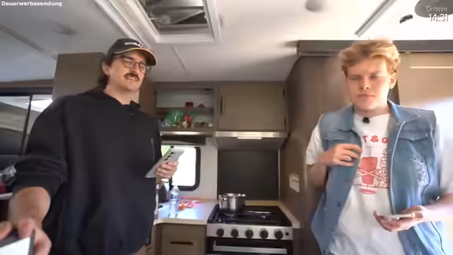08:54:57Die Diskussion über Baren mündet in einen humorvollen, aber übertriebenen Streit, der mit der Behauptung endet, die Mutter des einen Streamers würde den anderen töten. Nach dem Essen und dem Abspülen wird die Weiterfahrt angetreten. Der Streamer macht sich über die logistischen Probleme des Campers lustig und bezeichnet das Ganze als 'Edelmetall-Tour'.