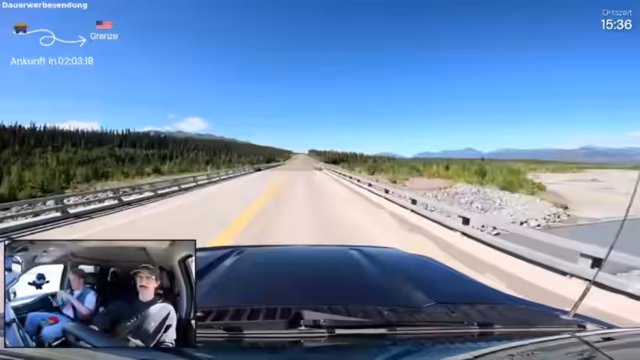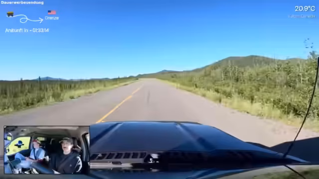 00:20:50Auf dem Weg zu den ersten Schürfgebieten stellt sich heraus, dass die Route durch Alaska führt. Für die Einreise in die USA benötigen die Streamer ein ESTA-Visum, was sie nicht beantragt haben. Gleichzeitig sorgt das Aussehen des großen Campers und explizite Nachrichten auf den Handys für die Sorge, an der Grenze abgewiesen oder sogar festgehalten zu werden. Die Route muss nun spontan angepasst werden.