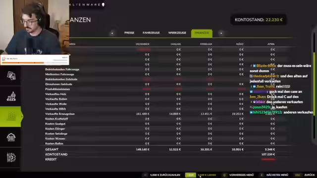 11:18:50Der Streamer analysiert die finanzielle Situation im Spiel, stellt fest, dass trotz eines vollen Weizenspeichers und eines guten Fendt Vario 942, das gesamte Brot verkauft wurde und nur noch 325.000 verfügbar sind. Durch die Aufnahme eines Kredits steigt das verfügbare Kapital auf 613.000, was es ermöglicht, Ackerland 8 für 281.000 zu erwerben und die Schulden auf 1,3 Millionen zu erhöhen. Trotz der hohen Verschuldung vertraut die Bank weiterhin. Es wird beschlossen, die Hühner zu verkaufen, was jedoch zunächst auf Schwierigkeiten stößt. Der Fokus verschiebt sich auf den Anbau von Soja, wobei geplant ist, ein Feld mit Soja zu bepflanzen und die Ernte direkt ins Getreidesilo zu werfen, um schnell Kapital zu generieren. Es wird diskutiert, ob ein weiteres Weizenfeld angelegt werden soll, bevor auf Soja umgestellt wird, um die Brotfabrik nicht leerlaufen zu lassen.