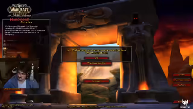 02:57:35Der Tod des Charakters (Level 24) löst eine Debatte über Fortsetzungsmöglichkeiten aus. Der Streamer erwägt, den Charakter auf einen PvP-Server zu transferieren, um nicht komplett neu starten zu müssen. Gleichzeitig plant er, trotz Weihnachtsfeiertagen und einer bevorstehenden LAN-Party weiterzuspielen. Es wird über Klassenwahl für das bevorstehende Event diskutiert: Schurke vs. Krieger. Ein unterbrechender Clip von Chef Strobel, der den Tod kritisiert, wird humorvoll aufgenommen. Die Gruppe betont, dass Fehler (z.B. vergessene Abilities) zu Lerneffekten führen sollen, um im zukünftigen Projekt Hardcore-Dungeons sicherer zu meistern.