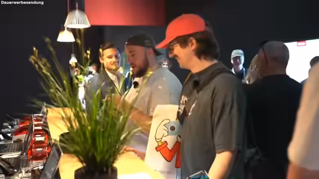 01:13:18Beim Besuch des Messestands von AEG wird dem Streamer eine Risotto-Zubereitung vorgeführt. Gleichzeitig wird intensiv versucht, mit den Marketing-Beauftragten des Unternehmens in Kontakt zu treten, um eine mögliche Zusammenarbeit oder Gratisprodukte wie einen Airfryer zu erfragen. Es wird versucht, Kontakt aufzunehmen, Visitenkarten auszutauschen und die Kooperationswünsche für die YouTube- und Twitch-Kanäle deutlich zu machen. Das Gespräch verläuft jedoch zunächst unergiebig.