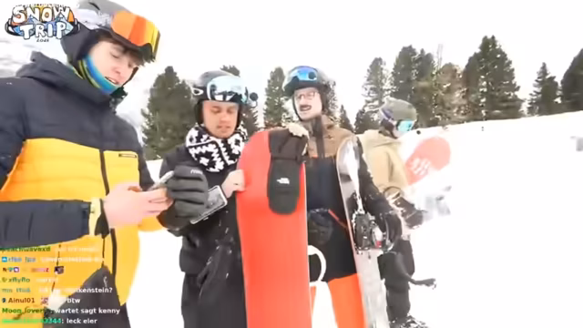 00:43:17Nach dem Start ins Snowboarden diskutiert das Team den Tagesablauf. Geplant sind neben dem Snowboarden auch weitere Aktivitäten wie Nachtski, Snowbiken und ein Besuch in der Sauna. Beim Snowbiken gibt es Bedenken, da die Anlage für erfahrene Fahrer konzipiert ist und das Team das für sich als gefährlich einschätzt. Gleichzeitig gibt es eine humorvolle Diskussion über mögliche Stream-Inhalte, wie einen Koch-Livestream mit Frank Rosin, und die Crew testet verschiedene technische Setups für den Livestream.