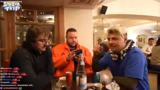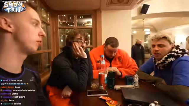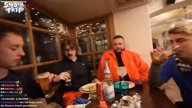 04:40:24Nach anstrengenden Fahrten erreicht die Gruppe eine Hütte und gönnt sich eine verdiente Heißgetränkpause. Die Atmosphäre ist gelöst, die Männer tauschen Anekdoten und stoßen auf den bisherigen Verlauf des Tages an. Es wird über die Belohnung für eine erfolgreich absolvierte Challenge gesprochen, bei der es um einen freien Trank geht. Nach der Pause wird die Weiterfahrt zur Rodelbahn vorbereitet. Der Plan ist, die Snowboards abzulegen und direkt ohne großen Übergang ins Rodeln einzusteigen, um den Tag mit Action abzuschließen.