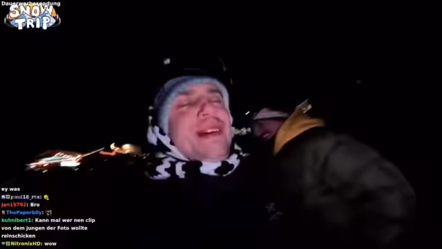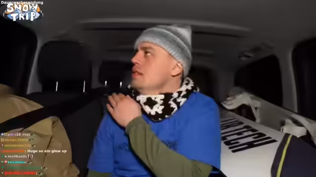 01:51:08Das Abenteuer wendet sich zur Krise, als Guide Kenny in tiefem Schnee stecken bleibt und seine Skier verliert. Die gesamte Streamer-Crew beschließt, ihn nicht zurückzulassen und wartet, bis er sich befreit hat. Dies führt dazu, dass auch die anderen Mitglieder, Kevin und Hugo, im tiefen Schnee feststecken und ihre Bindungen lösen müssen. Sie müssen zu Fuß einen erheblichen Weg zurücklegen, wobei sie von lokalen Anwohnern und einem Rettungsteam unterstützt werden. Die Stimmung ist geduldig, aber die körperliche Anstrengung und der Stress sind spürbar.