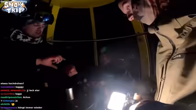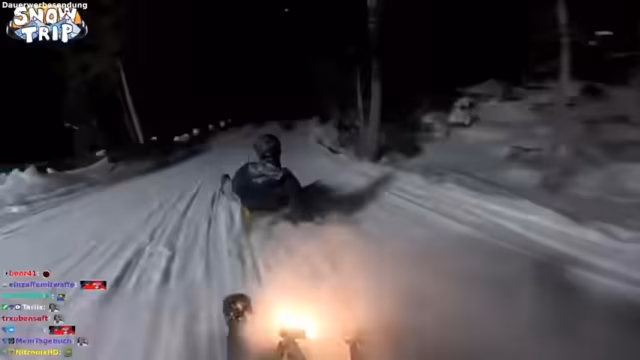 09:17:50Nach der Vorbereitung starten die Streamer endlich mit dem Nachtsnowboarden. Die Piste ist sehr dunkel und schlecht beleuchtet, was für gefährliche Situationen sorgt. Mit selbstgebastelten Lichtlösungen, wie Kopflampen und GoPro-Lichtern, machen sie sich auf den Weg. Die Gruppe bleibt dabei nah beieinander und streamt live vom Berg.