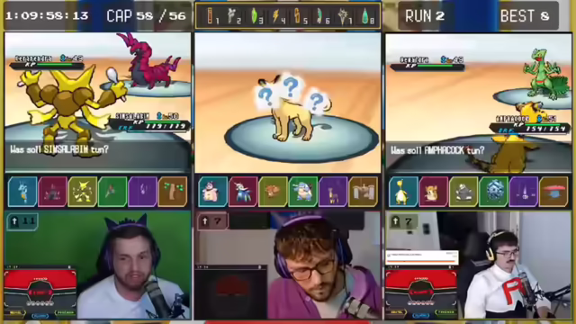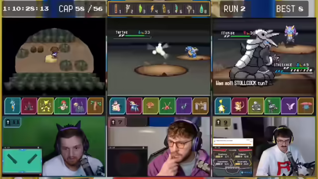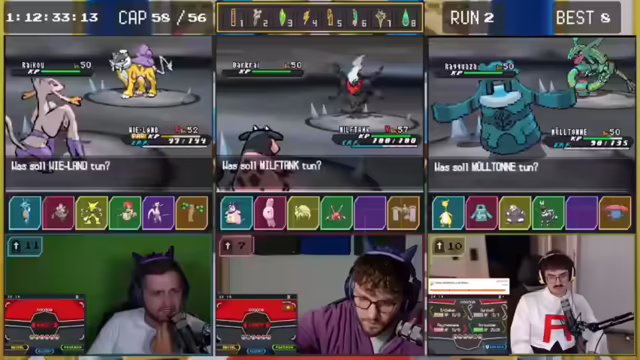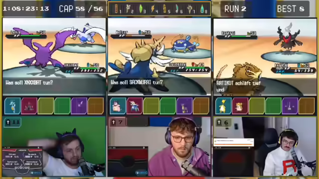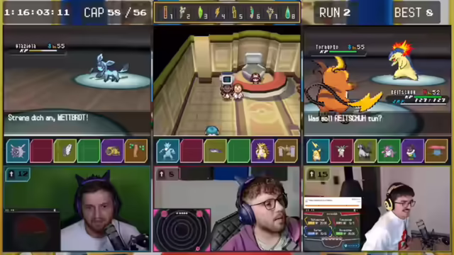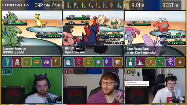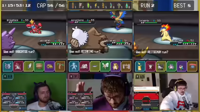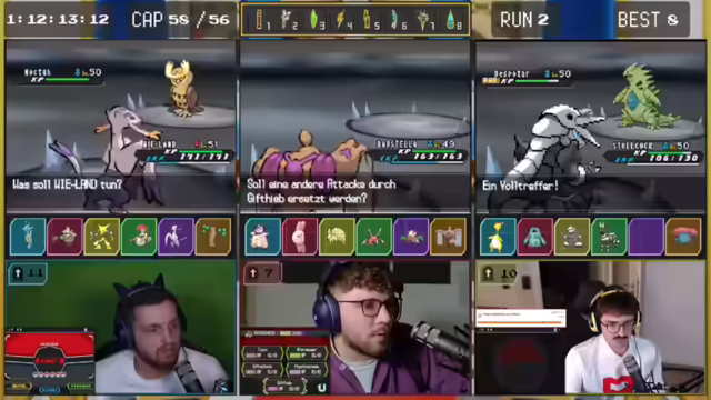 10:12:52Die Gruppe setzt ihre Kämpfe fort und diskutiert intensiv über die besten Vorgehensweisen. Es kommt zu unerwarteten Wendungen, wie der Verwandlung eines Pokémon, die für Verwirrung sorgt. Die Teammitglieder geben sich gegenseitig Ratschläge und analysieren die Züge des Gegners, um die effektivsten Konter zu finden. Dabei werden verschiedene Typenkombinationen und Attackenstrategien in Betracht gezogen. Die Diskussionen sind oft hitzig, aber konstruktiv, da jeder versucht, seinen Teil zum Erfolg beizutragen. Es werden auch riskante Entscheidungen getroffen, wie der Einsatz von Attacken mit niedriger Trefferwahrscheinlichkeit, in der Hoffnung auf einen entscheidenden Vorteil. Die Gruppe analysiert die Fähigkeiten des Gegners und versucht, diese zu kontern oder zu minimieren. Es wird auch die Möglichkeit von Statusveränderungen wie Paralyse diskutiert und wie diese den Kampf beeinflussen können. Die Gruppe tauscht sich über mögliche Attacken und deren Auswirkungen aus und versucht, alle Eventualitäten zu berücksichtigen und eine Strategie zu entwickeln, die sowohl offensive als auch defensive Elemente beinhaltet.