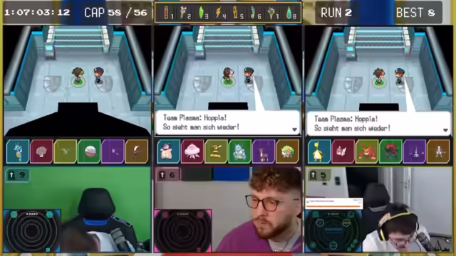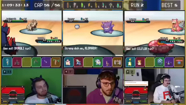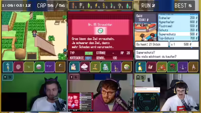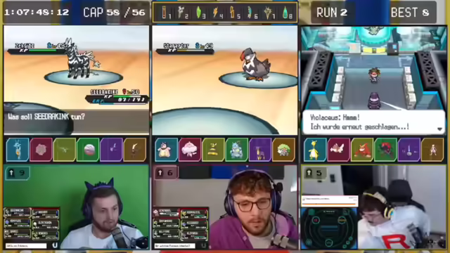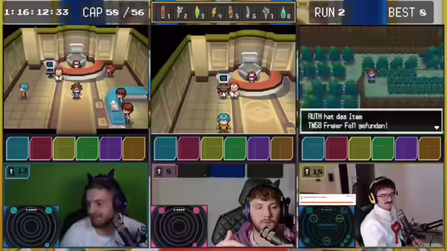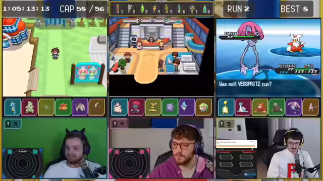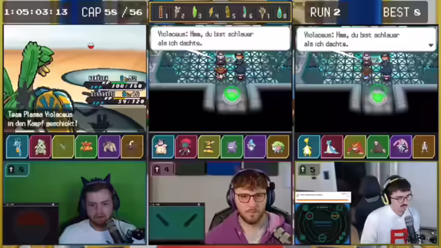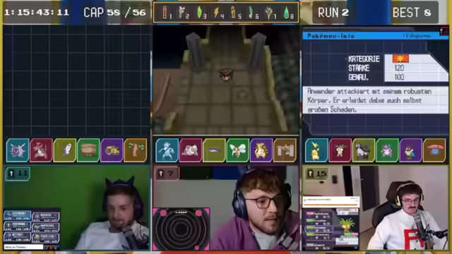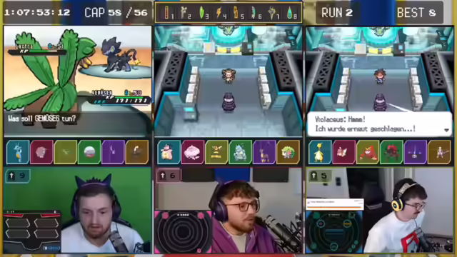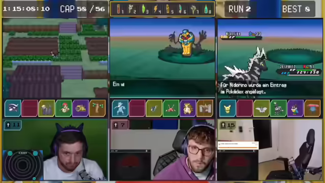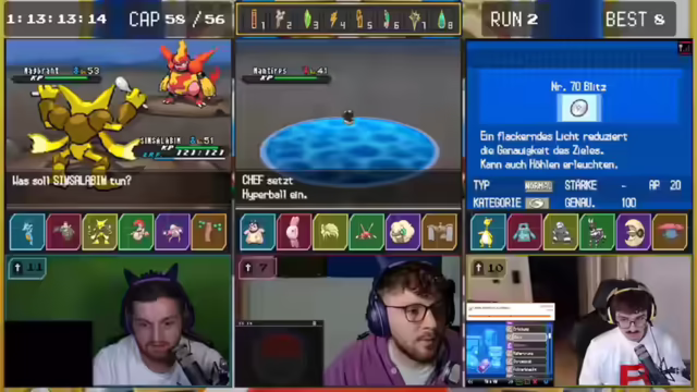 15:34:20Die Gruppe navigiert durch die Spielwelt, wobei sie sich auf die Suche nach einem bestimmten Encounter konzentriert. Es wird darüber diskutiert, wie man Trainer ausweicht und welche Route man nehmen muss, um zum Ziel zu gelangen. Die Teilnehmer stellen fest, dass sie überlevelt sind, was die Kämpfe potenziell schwieriger macht. Es wird überlegt, wem man Blitz beibringen soll und wie man den Staub in der Höhle schnell spawnen lassen kann. Die Gruppe plant, wie sie gegen bestimmte Pokémon vorgehen will, insbesondere Knogga, und welche Attacken sie einsetzen soll. Es wird auch darüber diskutiert, wie man Blitz auf Simsala bekommt, ohne eine wichtige TM zu verlieren. Die Gruppe tauscht sich darüber aus, wo man bestimmte Items und TMs findet, wie z.B. Blitz in Stratos City. Es wird auch überlegt, welche Pokémon man für bestimmte Kämpfe einsetzen soll, und es werden Strategien entwickelt, um diese zu gewinnen. Die Gruppe stellt fest, dass sie viele Pokémon verloren hat und dass die verbleibenden Pokémon gut vorbereitet sein müssen, um erfolgreich zu sein.