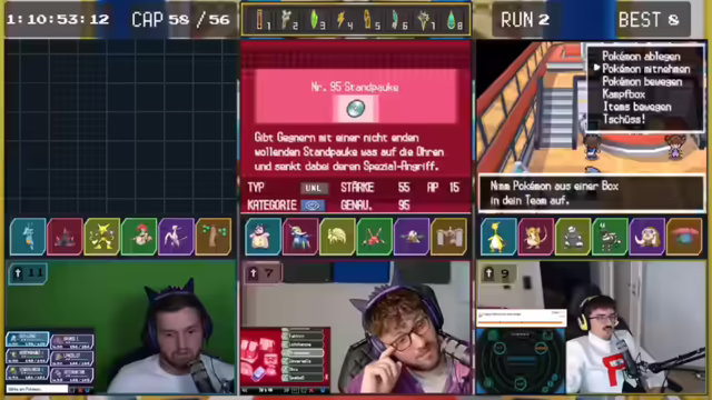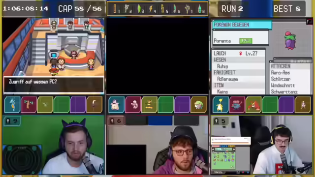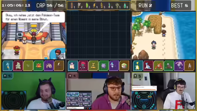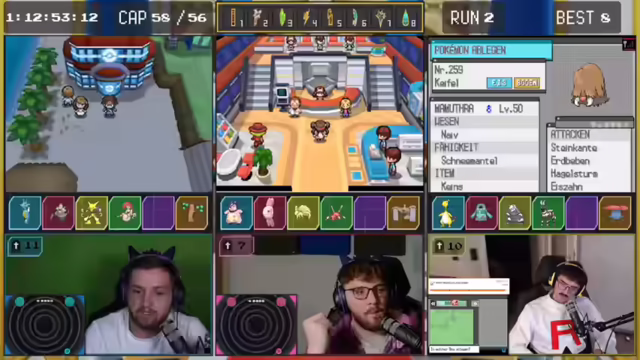 18:04:17Es wird festgestellt, dass trotz eines "perfekten Runs" das Spiel in drei Tagen nicht durchgespielt werden kann, was zu Frustration führt. Es wird beschlossen, zum PokéCenter zurückzukehren, da die Story woanders weitergeht. Es wird humorvoll angemerkt, dass seit 50 Stunden ein Mogelbaum im Team ist, der fliegen kann. Es wird überlegt, ob um Mitternacht, in dreieinhalb Stunden, noch der Donnerstags-Encounter Static mitgenommen werden kann. Die Teamzusammensetzung wird diskutiert, wobei festgestellt wird, dass nur noch "Scheiße" im Team ist. Es wird überlegt, ob Procolos mitgenommen werden soll, da das Team radikal verändert werden muss. Es wird festgestellt, dass Chefschrubbel ein starkes Team hat und nun ein Link benötigt wird, der für Romathra stark ist, da dieser Probleme mit Stahl-, Elektro- und Boden-Pokémon hat. Es wird der Wunsch geäußert, Wasser-Pokémon abzugeben, da diese im eigenen Team fehlen. Es wird betont, dass ein Flug-Pokémon benötigt wird, da das Team aktuell nur zwei Typen abdeckt.