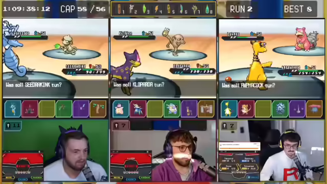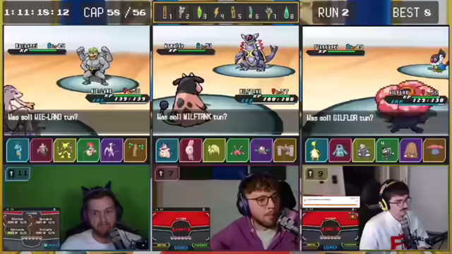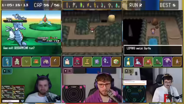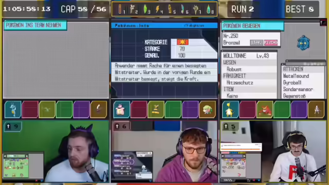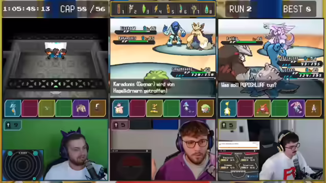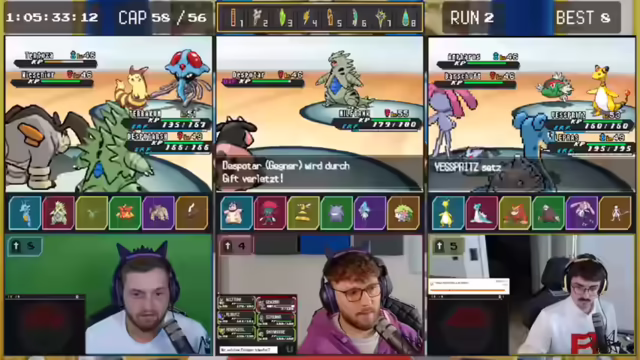 16:58:05Ein Pokémon ist vergiftet, ohne Schaden zu nehmen. Das nächste Problem ist ein Flugpsycho, das Wasserattacken macht. Es wird überlegt, eine Donnerwelle einzusetzen, obwohl es schneller ist. Funkensprung und Voltwechsel werden in Betracht gezogen, aber es besteht die Gefahr, dass Sebritz stirbt. Es wird überlegt, auf Ampharos zu wechseln, aber es könnte durch eine Psycho-Attacke von Lugia one-shot werden. Herr Strobel ist bereits bei den Top 4. Es wird festgestellt, dass man nach dem Kampf gegen die Insel nicht mehr geheilt wird, was als unfair empfunden wird. Es wird ein schwacher Starter benötigt. Gegen die nächsten drei Gegner soll kurz selbst gespielt werden. Gegen einen Boden-Only-Gegner wird überlegt, was zu tun ist, da keine Flug-Pokémon vorhanden sind. Es wird geprüft, ob Zwirfinz Schwebe hat. Es wird Hilfe beim Taurus benötigt. Alle sollen nacheinander spielen. Zwirfinz hat keine Schwebe. Der Schaufler muss getankt werden. Es wird überlegt, Cedra King einzusetzen, um den Gegner mit Surfer zu besiegen. Es wird gehofft, dass kein Crit erfolgt.