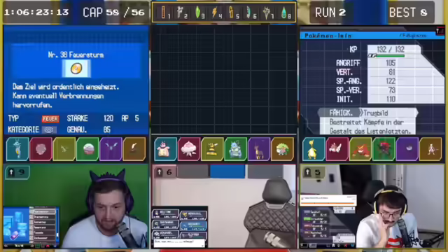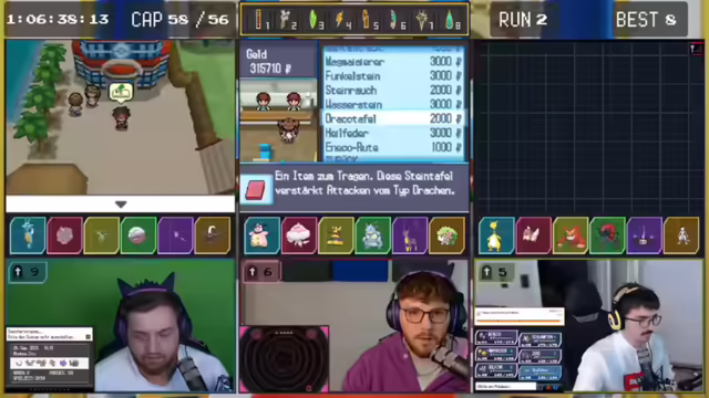 13:54:30Es wird ein gutes Setup für Irocakes, Vigometri und Keyflor gesucht, wobei nach einem Feuerstein gesucht wird. Gigasauger wird als tolle Attacke bezeichnet. Es wird gefragt, ob Fasage physisch oder speziell angreift. Die Teams werden als nicht überlebensfähig für die Top 4 eingeschätzt. Erholung, Daunenreigen und Knirscher werden diskutiert. Es wird gefragt, wo man Erholung herbekommt. Die Kombination von Grimasse und Hammerarm wird als krass bezeichnet. Es wird überlegt, ob man Steinkante oder Steinhagel auf Mogelbaum spielen soll, wobei Steinhagel aufgrund der höheren Genauigkeit bevorzugt wird. Es wird geprüft, ob Duflor Chlorophyll hat. Sonntag kann man kaufen, aber woher bekommt man Solarstrahl? Es wird überlegt, ob man Giflor Giftschleim geben soll. Flammerad oder Feuerzahn für Vigometrie werden diskutiert. Es werden Attacken für Seedraking festgelegt. Flammenwurf wird gelernt. Es wird gefragt, was Wutanfall ist. Akrobatik auf Versagenkopf wird als unkomfortabel angesehen. Flammenblitz wird diskutiert, aber aufgrund des Selbstschadens verworfen. Sonntag, Mondschein und Gigasauber werden als Attacken festgelegt. Die Frage, wo man IDCP herbekommt, wird aufgeworfen. Das Problem, dass bei jedem Tod der Lead mitstirbt und die Gegner-Pokémon höhere Level haben, wird angesprochen. Es wird beschlossen, nicht mehr zu leveln. Es wird gefragt, wo man Stärke wegmachen kann. Es wird überlegt, welches Item man Sneaky Golem geben soll. Es wird gefragt, ob Sonntag schon gekauft wurde.