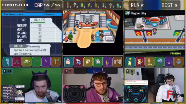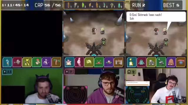 11:51:23Die Zuschauer werden aufgefordert, die Instagram-Story anzusehen und ehrlich zu sein, ob sie bei einem bestimmten Bild schmunzeln mussten. Es wird kurz darüber diskutiert, warum der Streamer so rumgeschrien hat und ob es hitzig war. Anschließend wird die Tischordnung und die Sauberkeit des Tisches mit dem von Chef Brobel verglichen. Es wird erwähnt, dass auf dem Tisch Poké-Welle gemacht wurde und warum die Sachen noch da stehen. Der Streamer muss nun alle Poké-Center abklappern. Es wird festgestellt, dass sie wieder zu dem Schiff müssen und sich dort im Doppelkampf ficken lassen müssen. Es wird erwähnt, dass noch drei Bosskämpfe, die komplette Siegesstraße und die Top 4 bevorstehen. Es wird noch viel Zeit in Pokécentern verbracht werden müssen, um die Teams zu bauen. Das Finstrio muss noch besiegt werden, aber der Name wird als beschissenster Name im ganzen Spiel bezeichnet.