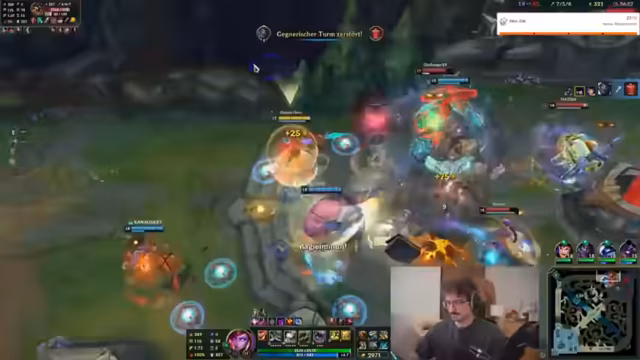 07:42:56Nach einem frühen Rückschlag durch den mächtigen Mordekaiser des Gegners, der mehrere Teammitglieder eliminiert, muss das Team einen Gegenangriff starten. Man beschließt, den oberen Turm zu pushen und dabei ein zu erwartendes Teamfight einzugehen. Der Gegner positioniert sich für einen Kampf am oberen Turm, was das eigene Team zu einem koordinierten Flankenmanöver nutzt. Durch clevere Verwendung von Ultis, wie der von Sivir, wird das gegnerische Team besiegt, der Draken-Soul gesichert und der Grundstein für den Sieg gelegt.