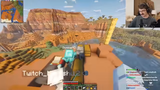 02:45:09Metashi wird als „Knabe-Cola-Partner“ und „Brand Ambassador“ vorgestellt, was zu humorvollen Diskussionen und Anfragen nach kostenlosen Getränken führt. Es wird über die Regeln des Servers gesprochen, insbesondere über das Öffnen von Kisten anderer Spieler. Die Gruppe trifft auf Maximilian, der ebenfalls in der Wüste ist und mit dem über die Knabe-Cola-Partnerschaft und die Zukunft des Bauprojekts gesprochen wird. Es kommt zu weiteren Neckereien und Diskussionen über die Lautstärke der Mikrofone und die allgemeine Stimmung im Stream.