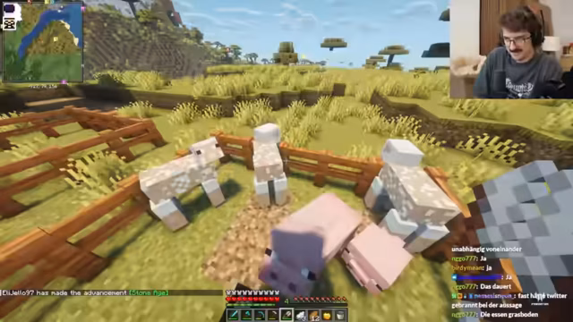 03:54:29Die Tierhaltung erweist sich als schwierig, da die Schweine versuchen, aus den Gehegen auszubrechen. Die Streamer müssen kreativ werden, um die Tiere im Zaum zu halten und in die richtigen Gehege zu leiten. Es wird die Idee aufgegriffen, Teppiche auf die Zäune zu legen, damit die Tiere nicht darüber springen können. Dafür muss Wolle von Schafen gesammelt und eine Schere hergestellt werden. Während ein Streamer sich um die Tierzucht und -trennung kümmert, arbeitet der andere an der Villager-Farm und dem Anbau von Karotten, um die Nahrungsversorgung sicherzustellen. Die Zusammenarbeit und die Bewältigung der kleinen Herausforderungen sind entscheidend für den Fortschritt des Projekts 'Goldhain'.