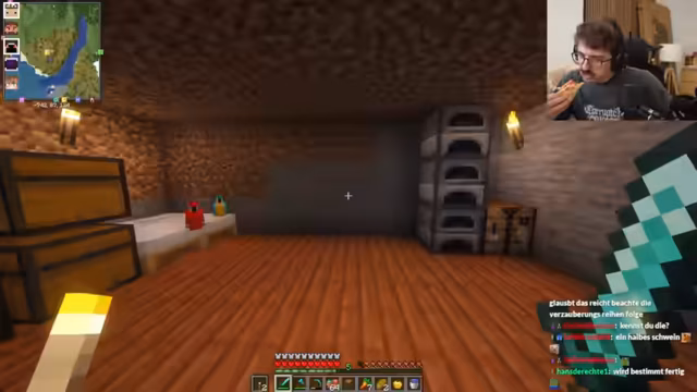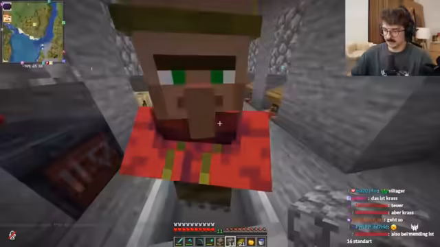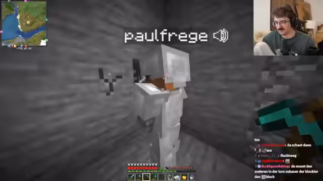 09:06:10Der Streamer und Paul diskutieren über den Bau von Geheimgängen durch das Schloss und bezeichnen sich selbst als „rote Org-Fraktion“. Der Streamer besucht Pauls Basis und ist beeindruckt von der Anzahl der Kisten und Papageien. Er äußert den Wunsch, ebenfalls Papageien in seiner Hütte zu haben. Paul erklärt, dass er nicht reich ist und seine Truhen leer sind, was der Streamer humorvoll als „Schwaben-Trick“ bezeichnet. Sie treffen auf Rhyol, der Paul in seine Farm eingebaut hat, um ihn vor Monstern zu schützen. Der Streamer fragt, ob er eine Kuh töten und essen kann, was Paul jedoch ablehnt. Paul bietet an, Brot zu besorgen, indem er einen Villager zu einem Essens-Trader macht. Er demonstriert, wie er Villager aus einem „Pet-Dispenser“ holt und versucht, einen Villager dazu zu bringen, einen Job anzunehmen. Der Streamer bezeichnet Paul humorvoll als „Sklavenhalter“ und „Menschenhändler“, während Paul sich als „CEO“ und „Geschäftsführer“ sieht. Sie entdecken einen Fluchtweg in Pauls Basis und der Streamer erhält von Paul eine komplette Eisenrüstung und Brot, wofür er sich herzlich bedankt. Der Streamer verabschiedet sich mit einem „fantastischen Abgang“ durch den Fluchtweg.