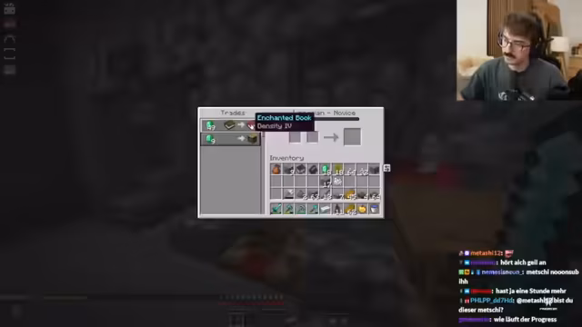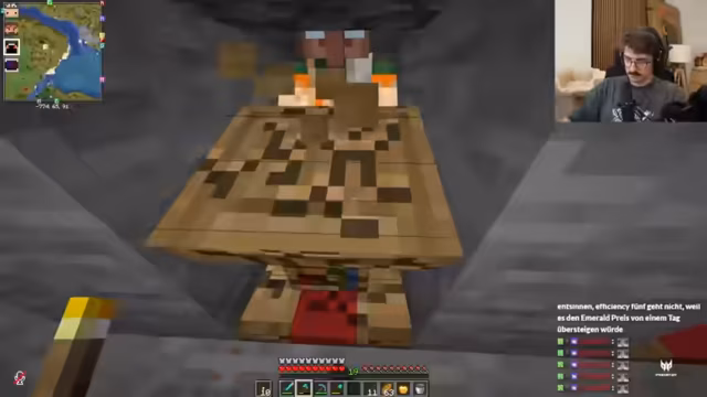 07:49:22Der Streamer äußert seine Vorfreude auf Metaschis Hardcore-Event und seine Teilnahme daran, ist sich aber noch unschlüssig bezüglich der Klasse und Rasse, tendiert aber zum Hunter. Er plant, Mending für seine Ausrüstung zu besorgen und benötigt dafür Eisen. Die Diskussion dreht sich auch um die Rolle des Healers in Classic-Spielen, wobei der Streamer Bedenken äußert, dass diese Rolle zu anspruchsvoll sein könnte. Er versucht, einen Villager zum Handeln zu bewegen, was sich als zäh erweist, und überlegt, ob ein fehlender Bookshelf oder ein falscher Block die Ursache sein könnte. Schließlich gelingt es ihm, einen Villager zu finden, der Mending für 22 Emeralds anbietet, was als fairer Preis empfunden wird.