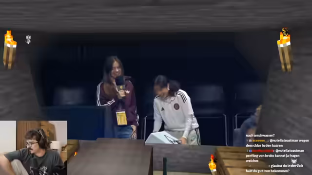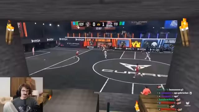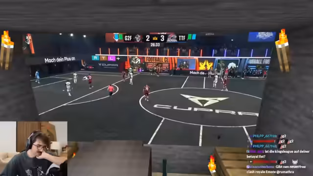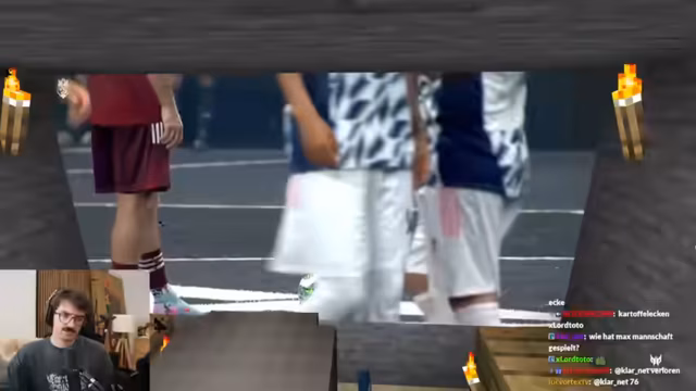 11:05:52Das Spiel beginnt, und die Streamer sind begeistert von der surrealen Erfahrung, das Minecraft-Spiel in diesem einzigartigen Setting zu verfolgen. Die Fackeln im Hintergrund tragen zur Atmosphäre bei. Die erste Aktion im Spiel ist ein Tor von Telly, der direkt in einem 2-gegen-2-Duell startet und damit seine Stärke unter Beweis stellt. Die Streamer freuen sich über die frühe Führung ihres Teams und die kontrollierte Spielweise. Es wird betont, wie wichtig es ist, in dieser Phase zu führen und G2 unter Druck zu setzen, da G2 als Mannschaft bekannt ist, die sich leicht verunsichern lässt. Die Regel, dass jede Minute ein Spieler hinzukommt, bis alle auf dem Feld sind, wird nochmals erläutert. Die Streamer sind optimistisch und loben die solide Verteidigung und den Einsatz ihres Teams, während sie weiterhin die technischen Einstellungen der Übertragung optimieren, um das bestmögliche Seherlebnis zu bieten.