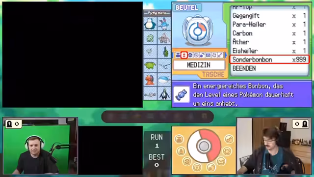 02:31:47Nach einem erfolgreichen Kampf wird das Spiel kurz gesichert, um den aktuellen Stand zu konsolidieren. Anschließend wird auf eine Spielmodifikation zurückgegriffen, um dem Partner Sonderbonbons zu übergeben. Die technische Übergabe gestaltet sich jedoch schwierig, da der Export und Import des Speicherstandes zunächst fehlschlägt. Nach mehrmaligen Versuchen und einer Korrektur der Vorgehensweise (Export als SAV-Datei) kann die Aktion erfolgreich abgeschlossen werden, und beide Partner nutzen die Bonbons zur Level-Optimierung ihrer Pokémon.