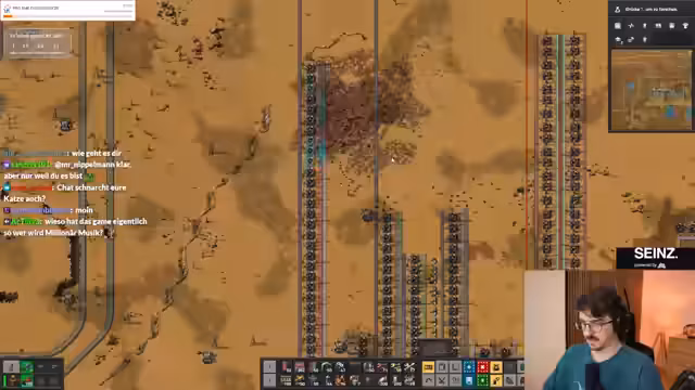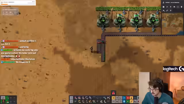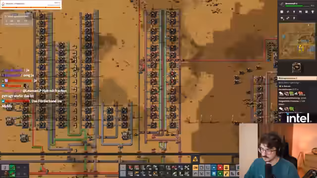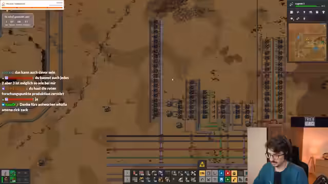 00:37:14Die Herstellung neuer Forschungstränke (lila Tränke) wird als Tagesaufgabe angesehen. Die Herstellung von Gleisen, Lichtbogen, Open und Produktivitätsmodulen wird geplant. Die Funktion von Produktivitätsmodulen wird diskutiert. Es wird Munition und Geschütze hergestellt. Flugzeughangare werden hergestellt. Es ist Nacht und ein Aufbruch wird verschoben. Die Umweltverschmutzung wird beobachtet. Es wird Stahl benötigt. Die Reparatur der Basis dauert lange. Ein Ressourcenvorkommen wird abgebaut. Große Würmer werden bekämpft. Der Laserschaden wurde generft. Es wird mehr Stahl benötigt. Es fehlt Stahl zum Bauen. Es werden bessere Kampfroboter benötigt. Der Panzer wird als beste Option zum Clearen von Beißernestern angesehen. Es werden explosive Kanonengeschosse für den Panzer hergestellt. Sprengstoff wird benötigt. Es herrscht Ressourcenmangel. Es wird Schwefel benötigt, um Waffen herzustellen, um Nester zu clearen, aber Schwefel benötigt Öl, um Öl zu bekommen, müssen Nester gecleart werden. Es wird versucht, Schwefel per Hand herzustellen. Große Strommasten werden benötigt.