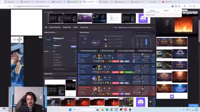 01:40:05Es wird über eine anhaltende Frustration mit dem Matchmaking-System gesprochen. Der Streamer berichtet, dass er nach einem Sieg gegen einen Emerald-Spieler, der vom Emerald 3 auf Emerald 2 aufgestiegen ist, fünf Spiele später auf einen Lucian trifft, dessen Spielstil dem von Bronze-Elo entspricht. Dies führt zu der Überzeugung, dass das Matchmaking-System 'beschissen' ist und unerklärliche Sprünge zwischen den Elobereichen verursacht, die den Spielspaß stark beeinträchtigen.